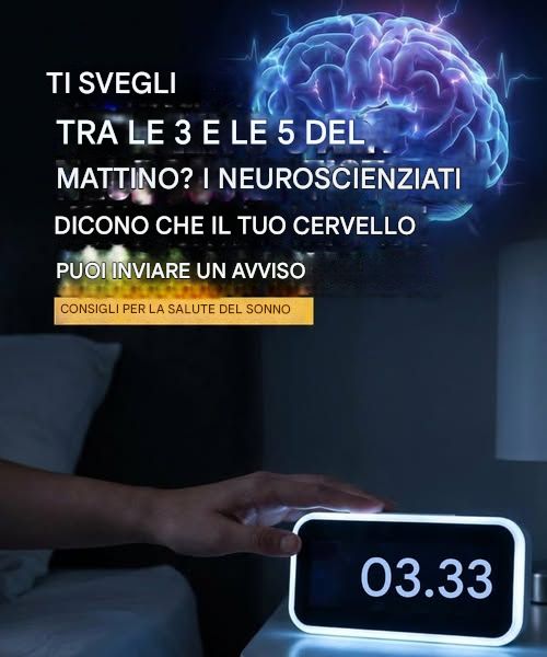 L’immagine mostra una persona che guarda una sveglia digitale che segna 03:33, con un grande cervello illuminato sullo sfondo e un testo in italiano che dice: